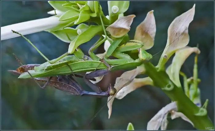 Даже любовь у богомолов не обходится без пролития крови. Как и многие насекомые, они размножаются только один раз в жизни, после чего умирают. И для того, чтобы биомасса не пропадала зря, самки во время полового акта всеми силами стараются скушать своего благоверного. Делают они это от большой любви. К будущему потомству. Так будущие мамочки пополняют запас питательных веществ для развития яиц.