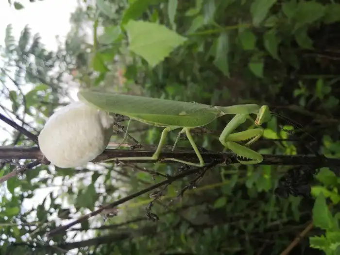 Будущая мама откладывает яйца на различные предметы в виде одной большой кучи — оотеки. Снаружи она покрыта слоем вещества, похожего на строительную пену. Эта «пена» защищает потомство от неблагоприятных условий окружающей среды. Внутри неё стройными рядами, как солдаты, стоят несколько десятков яиц.