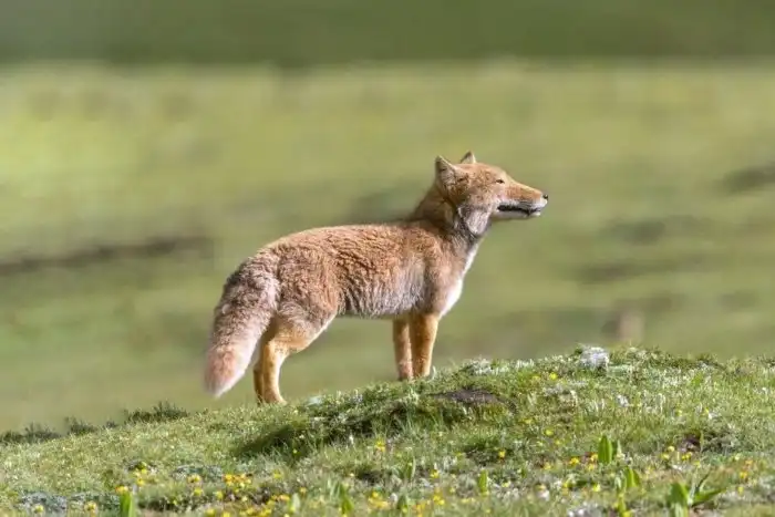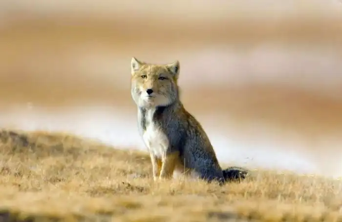Череп тибетской лисы сильно укороченный, а его скуловые дуги очень широкие. При этом шея у хищника покрыта плотной шерстью с очень густым подшёрстком. Из-за формы черепа и густой шерсти голова лисы кажется квадратной.Вообще, у нашего героя мало что лисьего. Ножки короткие и толстые. Сам он весь приземистый, какой-то бочкообразный. Никакого намёка на лисью стройность. А если смотреть на него в профиль, то он скорее похож на шакала или дворнягу с соседнего двора, а не на лису.