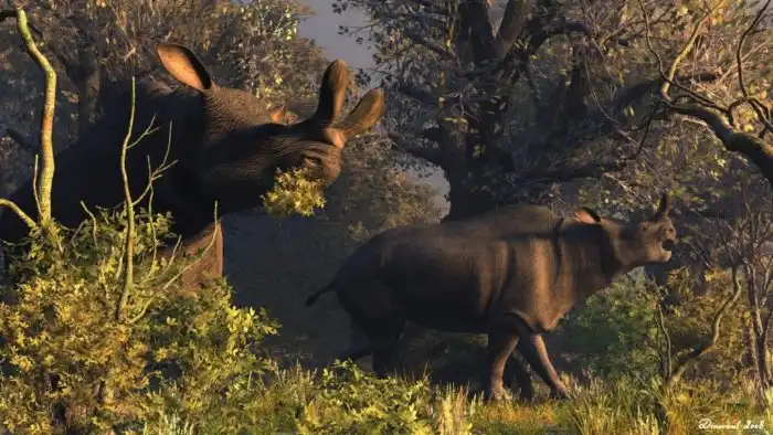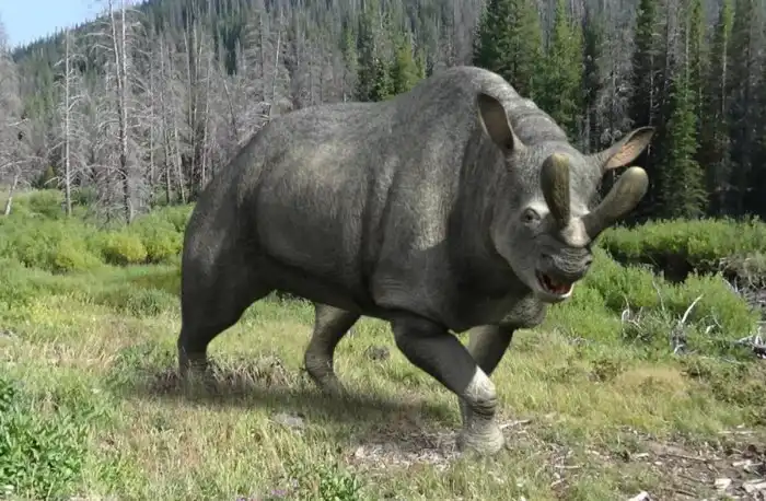 Как и полагается представителям мегафауны, выглядели бронтотерии монументально: до 2,5 метров в холке, до 5 метров в длину, до 4,5 тонн веса. Их визитной карточкой был мощный двойной рог на носу, которым можно было накостылять даже саблезубым кошкам — крупнейшим хищникам своего времени.
