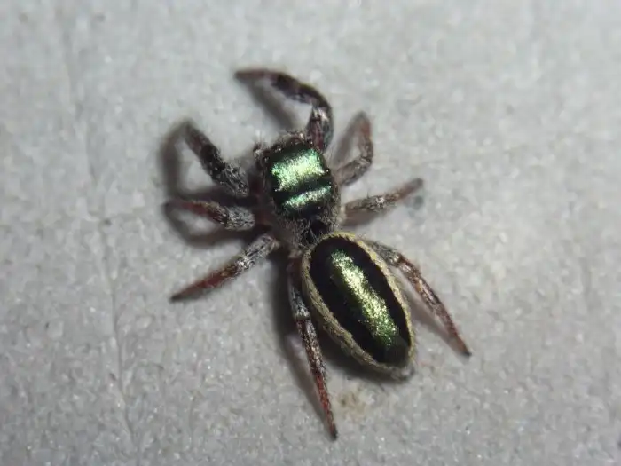 А ещё он зелёный! Спинная часть паучьей головогруди щедро окроплена изумрудной краской. Полоса такого же цвета проходит через всё брюшко. Любимое место жизни багир – яркие, сочные листья из рода вахелия. На них вызывающая окраска экзоскелета превращается в скромный и не привлекающий лишнего внимания наряд.