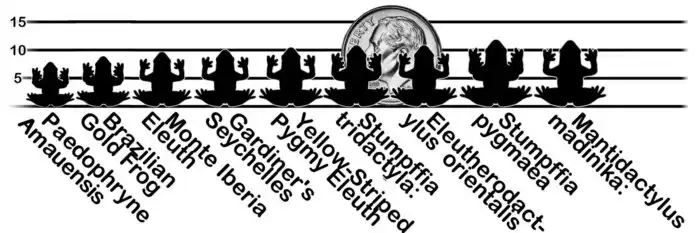 Если честно, подобных микролягух довольно много: только у нашей гостьи в таксономическом роду таких 9. Сначала учёные отыскали более крупных её родственниц — первый вид этого рода был длиной в 8 миллиметров. Но оказалось, что чем дальше в леса Новой Гвинеи, тем меньше лягухи: размеры каждого нового открытого вида уменьшались, как матрёшки.