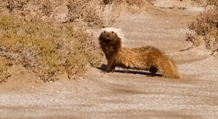 Ну а если вы загоните патагонскую ласку в угол, она превратиться в пушистую кобру — распушит шерсть на загривке и теле, зашипит. Короче, всеми силами покажет, что она не мелкая милая пуська, а злой и опасный хищник.