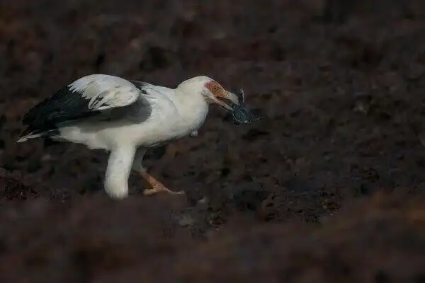 Увы, масляные пальмы плодоносят не вечно. В сезон неурожая пернатый вспоминает старые добрые охотничьи приёмы и переходит на классическую белковую диету. Добыча грифа — прибрежная живность: крабы, моллюски, земноводные, рептилии, выброшенная на берег рыба. Много ему не надо: пальмовый гриф — самый маленький гриф Африки. Понятное дело, надо было в детстве мяса больше кушать!