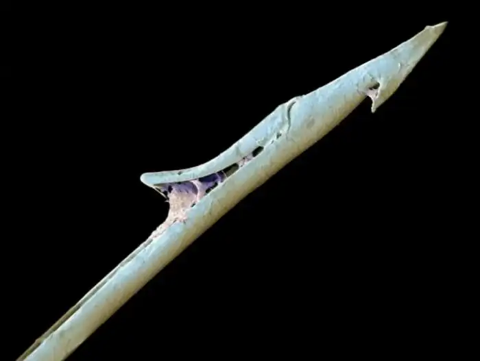 Таким образом, хоботок является чем-то средним между гарпуном и иглой шприца. Радула даже зазубрена, как гарпун, благодаря чему добыча не может сорваться с её конца.