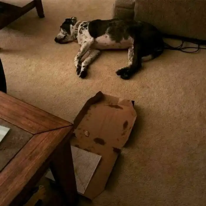 А этого четвероногого друга так утомило чувство вины за съеденную пиццу, что он просто уснул