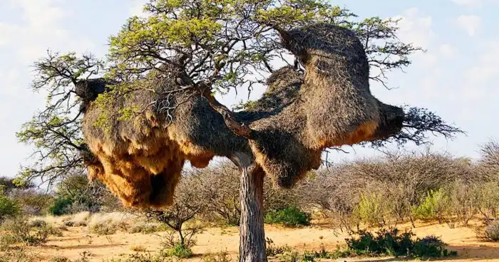 Гнезда птиц-ткачиков могут весить до одной тонны. А живут в нем более 100 крошечных птичек.
