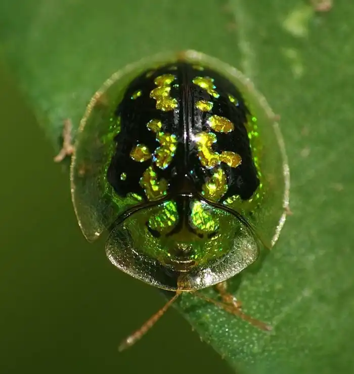 Немногие насекомые могут похвастаться по-настоящему золотым цветом тела. Жук золотая черепаха еще более примечателен тем, что он может менять свою окраску по собственному желанию благодаря микроскопическим полостям в кутикуле (у насекомых кутикула - важная составляющая экзоскелета), в которых находится пигментация.