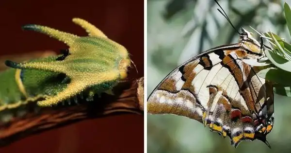 Гусеница этой бабочки напоминает кого угодно кроме самой гусеницы из-за своих огромных ярких ложных глаз. Они то и помогают ей отпугивать хищников до момента, пока из этой личинки не появится красивая бабочка-парусник. Интересный факт: личинка меняет свой цвет несколько раз до момента финального преображения.