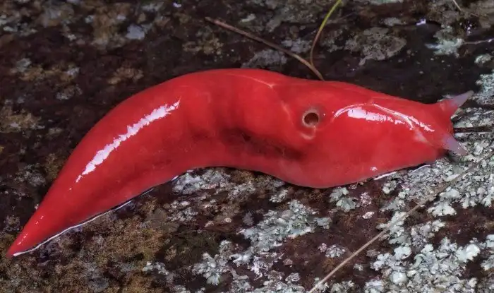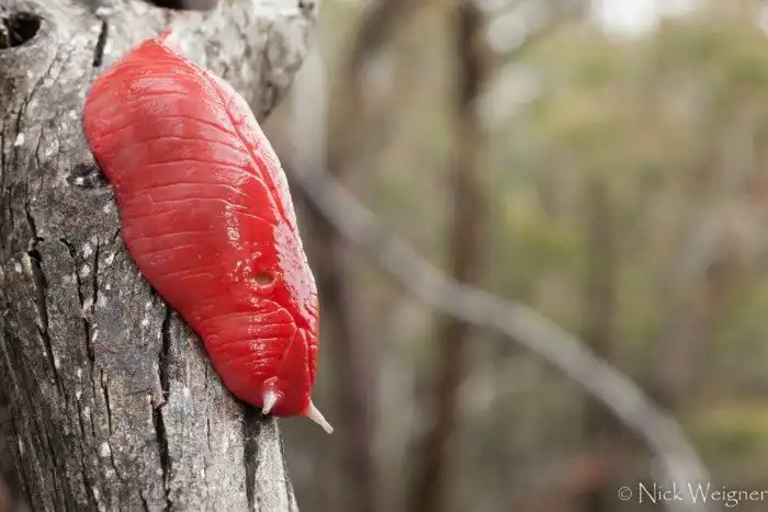 Ну а вечером моллюск добавляет в пейзаж нотку сюрреализма. Туристы, учёные и местные жители видят, как сотни огромных, до 20 сантиметров в длину, слизней цвета дешёвой жвачки лезут из под земли и рвутся к ближайшим эвкалиптам. Они хотят свежей пищи: беспозвоночные ищут мох, водоросли и улиток.