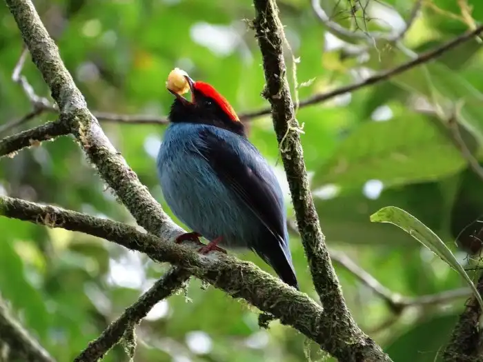 Танцы танцами, а обед по расписанию! Питаются манакины почти всеми ягодами и членистоногими. Благо, в тропических лесах этого добра навалом.