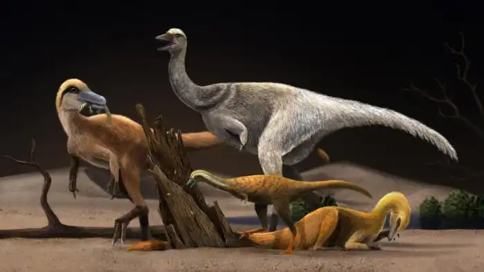 Семейство альваресзавров было покрыто перьями. Раньше даже считалось, что это не хищные динозавры-тероподы, а первые птицы. Только вот птицы живут и сейчас, а альваресзавры, во главе с линхеникусом, вымерли.