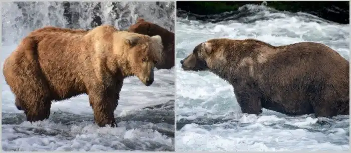 Так что же нужно сделать мишкам, чтобы принять участие в конкурсе? Они все должны побывать на реке Брукс, где установлены веб-камеры. За медвежьей рыбалкой тут наблюдают онлайн. Если исхудавший после спячки мишка приходит на берег весной и осенью, когда он активно готовится к зиме, у него есть все шансы стать победителем. Предлагаем вам посмотреть на участников сезона 2022 и подивиться тому, как меняются медвежье «до» и «после» спячки. Ну и, конечно же, узнать, кто стал победителем.Мишка по кличке Чанк в июле и в начале сентября