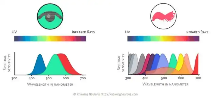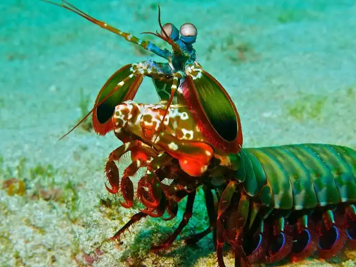 Кстати, про глаза. Они у рака-богомола тоже особенные. Мало того, что они вертятся на 90 градусов вне зависимости друг от друга, так ещё и цветов воспринимают в 4 раза больше наших. У раков-богомолов 12-канальное цветовое зрение. Для сравнения, человек воспринимает только 3 канала: красный, синий и зелёный.