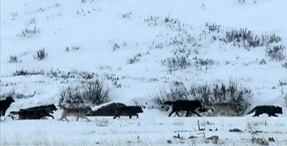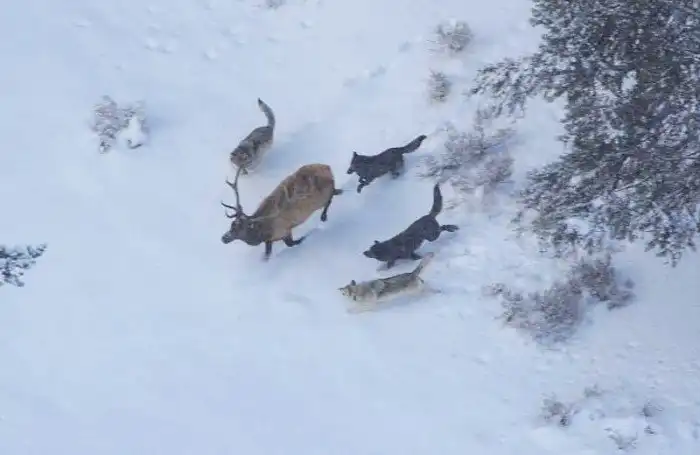 2003 год. Молодые волки загоняют вапити на засаду более опытных товарищей. Олень ещё не знает, но он обречён.