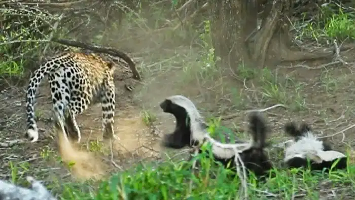 Леопард (или гепард?) вынужден отступить от разъярённой самки медоеда
