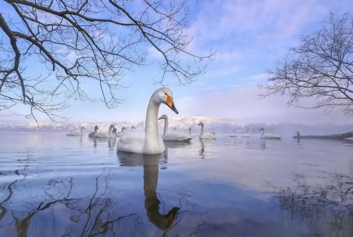 Спокойствие и безмятежность в одном кадре. Но не стоит обманываться: лебедям-кликунам нужно много места, и они проводят много времени, плавая и добывая пищу. Эти крупные птицы довольно шумные.