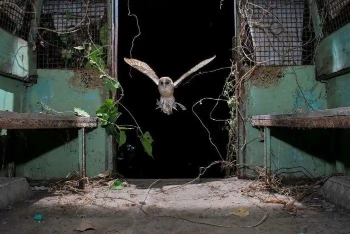 Амбарные совы на подоконниках, внутри заброшенных зданий, дымоходов или даже в торговом центре! Мы видели их всех. Самый распространенный вид наземных птиц не относится к своему титулу легкомысленно. Но в этом случае птица, кажется, ищет убежища в довольно необычном месте. Изображение с камеры-ловушки показывает, как сипуха влетает в заброшенный полицейский фургон. Снимок сделан в Мумбаи.