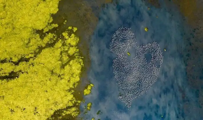 Замечательный вид с высоты птичьего полета на большую стаю фламинго в форме сердца. Это момент, когда розовые птицы носятся взад и вперед сплоченным строем. Так называемый танец ухаживания.