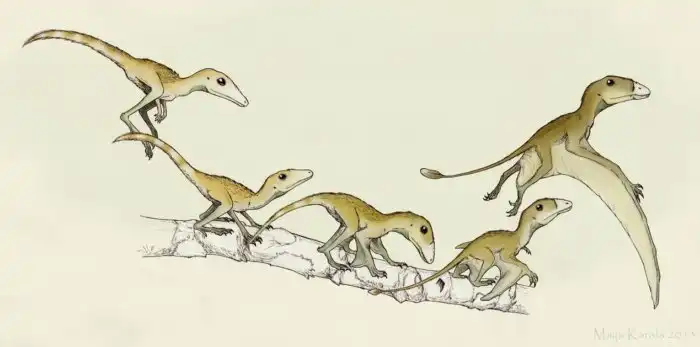 Задумали как-то архозавры в позднем триасе 235 млн лет назад небо покорить. Стали думать, кто первый рискнёт, кого не жалко... И решили взять самого щуплого. Будущий летун жил в Шотландии и был размером с ладошку. Начал бедолага тренироваться.