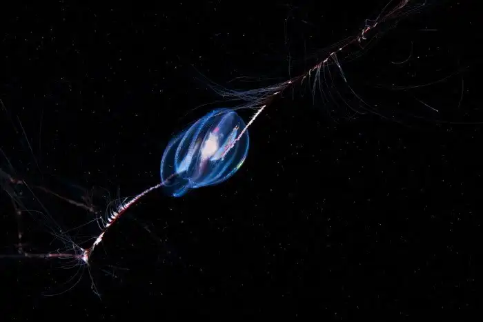 Но когда ты плавучее яйцо в ледяной бездне, то большего и не надо. Плавают, они, кстати, тоже нетривиально — при помощи ресничек. Словно одноклеточные инфузории туфельки из школьных учебников по биологии. Реснички объединены в ктены — специальные гребные пластинки. Такие пластинки работают в такт, как гребцы на палубе. Сами по себе мертензии прозрачны, но во время движения гребные пластинки совершают маленькую магию — раскладывают свет на все цвета радуги. Поэтому под направленным лучом животные мерцают металлическим блеском.