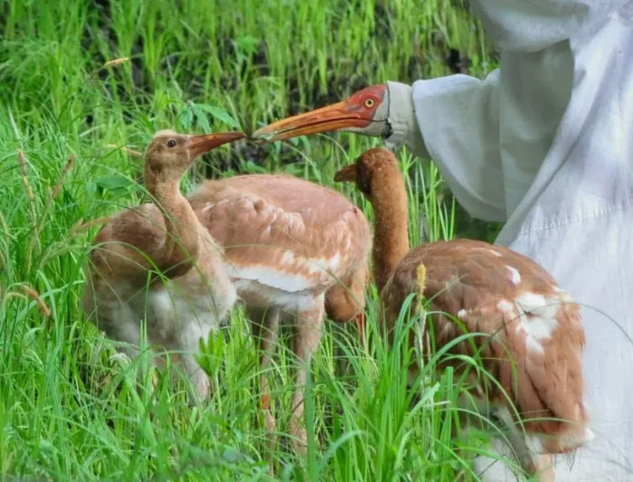 Этот же способ используют при выкармливании птенцов. Для муляжа используют тряпичные куклы родителей и даже полноценные модели птичьих голов, что крепятся на руке человека-кормильца. А в Окском заповеднике и вовсе шагают в ногу со временем — муляжи голов сибирских журавлей печатают на 3D принтере!