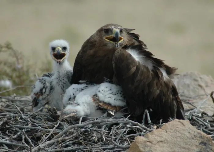 Степные орлы — одни из крупнейших представителей семейства ястребиных. В среднем птички набирают около 3 кило, но самые крупные особи порой весят рекордные 5,5 килограмм. Размах крыльев может быть больше 2,5 метров — внушительная тушка! Добавьте к этому длинные острые когти, зоркие глаза, стальные мускулы, крепкий изогнутый клюв и... ничего не произойдёт! Степной орёл не превратится в мегахищника. Зачем? Им и так неплохо живётся!