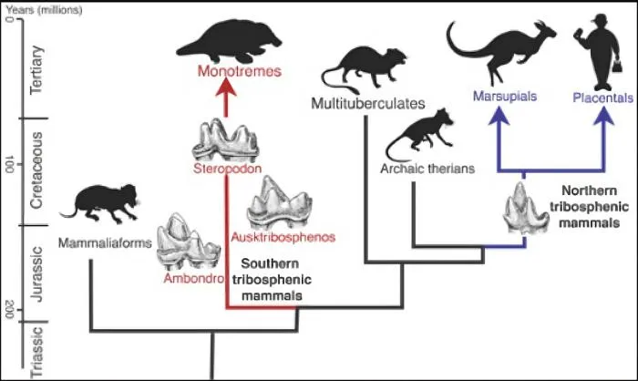 Но, что иронично, однопроходные уже тогда были морально устаревшей группой животных. Чтобы объяснить, почему, давайте углубимся в историю млекопитающих. Современная систематика делит их на три группы: однопроходные — здесь находится стероподон. Современные утконосы и ехидны тоже здесь. Сумчатые — кенгуру, коалы, вомбаты. Плацентарные — мы с вами.