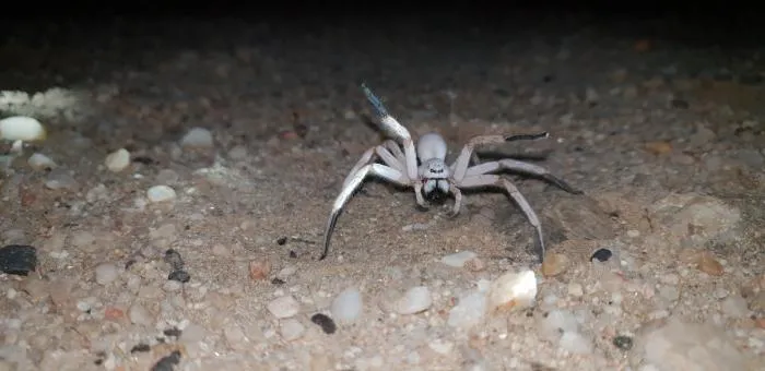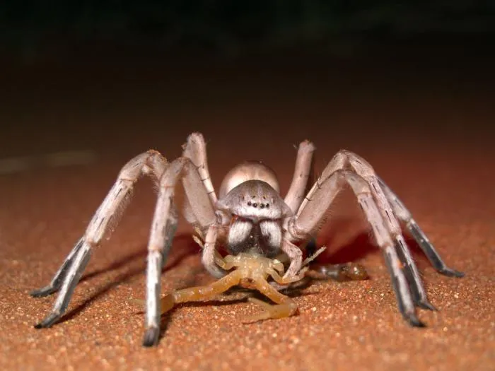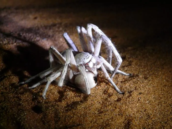 По своей воле паучиха покидает нору только в темноте. Её светлое тело почти незаметно на фоне песка. И это хорошо, ведь членистоногое не из маленьких. Длина вместе с лапками может быть больше 13 сантиметров. 4 пары длинных крепких конечностей отлично подходят для перемещения по песку и стремительным броскам на добычу.