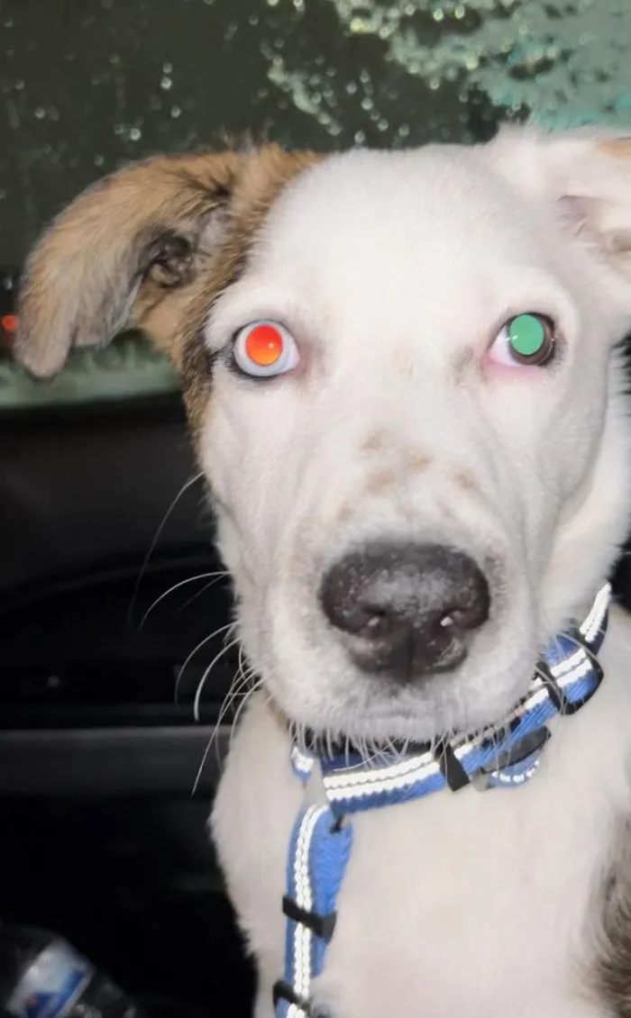 «У моего щенка глаза двух разных цветов (один голубой, другой темно-коричневый). Когда я фотографирую его со вспышкой, они светятся двумя разными цветами»