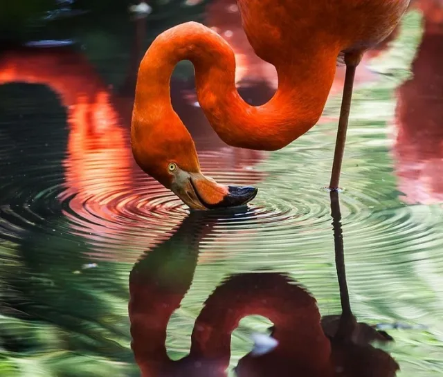 Фламинго питаются водорослями, семенами, личинками и мелкими ракообразными, которые водятся на мелководье. Чтобы отфильтровать еду, им необходимо наклонить голову, направив клюв к ногам. После этого они набирают в него воду, а затем выливают ее через гребенчатые пластины по краям клюва, оставляя еду внутри.