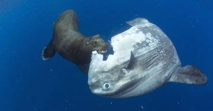 Как же такой гигантский аморфный мясной блин не едят? О, ещё как едят! Большая часть хищников не в силах скушать такую махину — она им не по зубам. Прочная шкура усилена хрящевой прослойкой толщиной в несколько сантиметров. Но акулы, касатки и морские котики с радостью отцапают от рыбы-луны кусочек. Причем в прямом смысле: хищники часто отгрызают кусок мяса и уплывают, позволяя живым остаткам дрейфовать дальше.