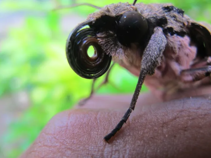 Как и ожидалось, у бабочки оказался здоровенный хоботок — целых 28,5 сантиметра. При том, что длина самого насекомого не больше 6 сантиметров. С помощью своего агрегата бражник абсолютно беспрепятственно добирается до нектара ангрекума.