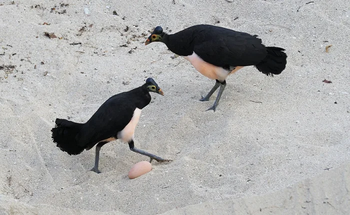Закопав отпрысков и замаскировав их прибрежным мусором, родители разворачиваются и уходят! Больше своих детишек они никогда не увидят! Песок будет «высиживать» кладку сам — его температура стабильно держится на уровне 33-35 °C. А новорожденные цыплята полностью самостоятельны с первых минут жизни! Большие яйца малео несут не просто так: в них куда больше питательных веществ, чем в яйцах обычных куриц. Птенец, только-только выбравшись из песка, и пищу себе сам найдёт, и убежит куда следует, и даже летать может!