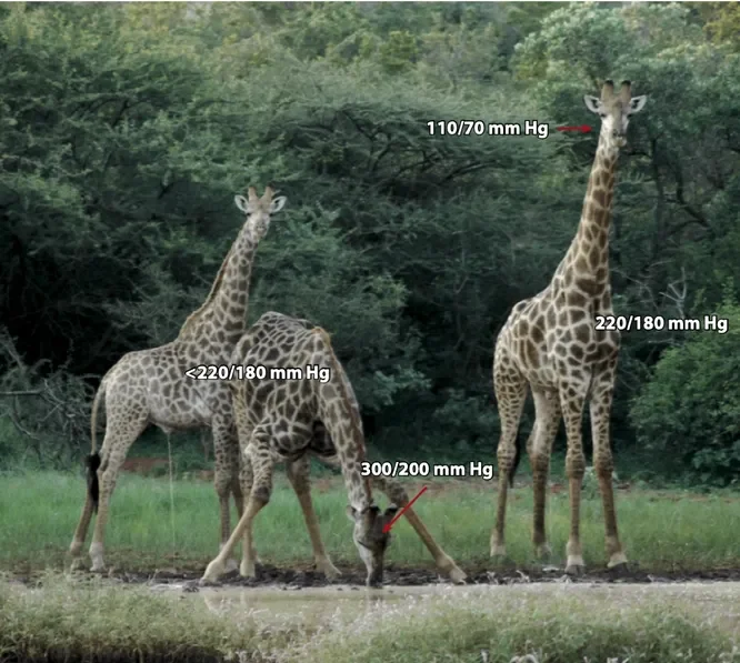 Давление на разных уровнях жирафа. Наверху оно такое же, как у нас – 110/70. На уровне сердца давление 220/180. А вот внизу оно достигает максимальных 300 мм ртутного столба. Это самое большое давление среди сухопутных млекопитающих!
