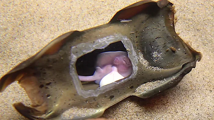 А что внутри? Об этом мы знаем благодаря опытам. В нескольких экспериментах учёные проделывали в яйцах ската окошко: вырезали отверстие в оболочке и вставили на место дырки пластик. Крошки-скаты развивались, даже не подозревая, что за ними пристально наблюдают.
