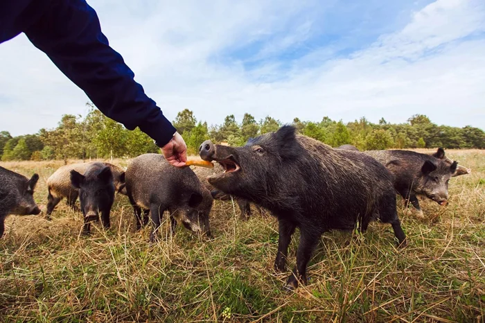Вот так делать с дикими кабанами категорически нельзя! Одно неверное движение — и стадо разъярённых свинок вас затопчет и поднимет на клыки.