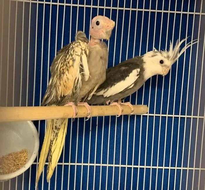 14. У этой самки попугая выпали перья, но один из самцов влюбился в птицу. Он защищает ее, кормит и играет с ней