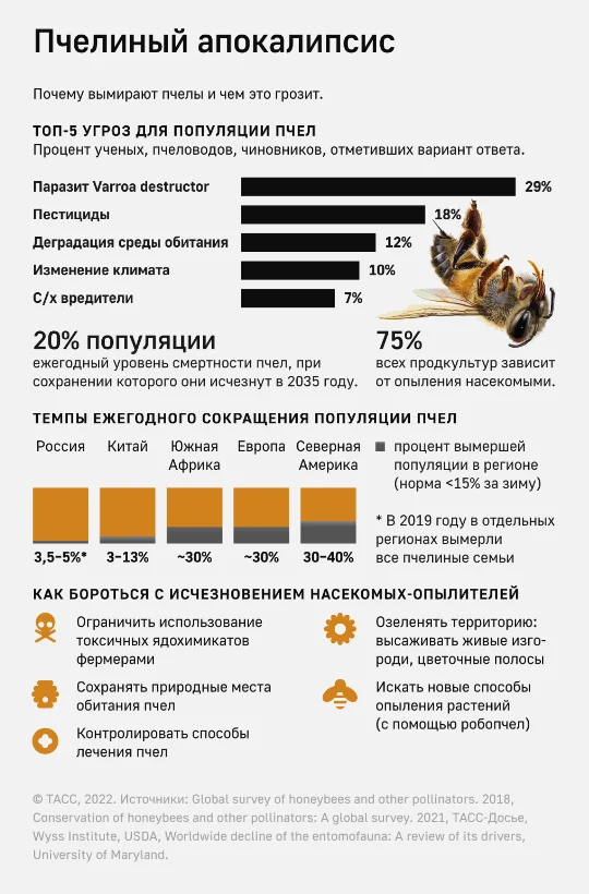 Другой неприятный пример: массовое вымирание пчёл, развивающееся в общей канве шестого великого вымирания. Начиная с 1950 года общепланетная численность пчёл сократилась на 50%, несмотря на то, что вымерло относительно небольшое количество видов. А ведь пчёлы — главные опылители цветковых растений. Понижение их численности повлияет и на состав флоры. А вместе с ней меняются и целые экосистемы.