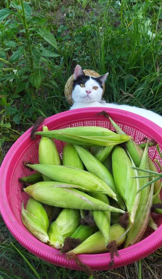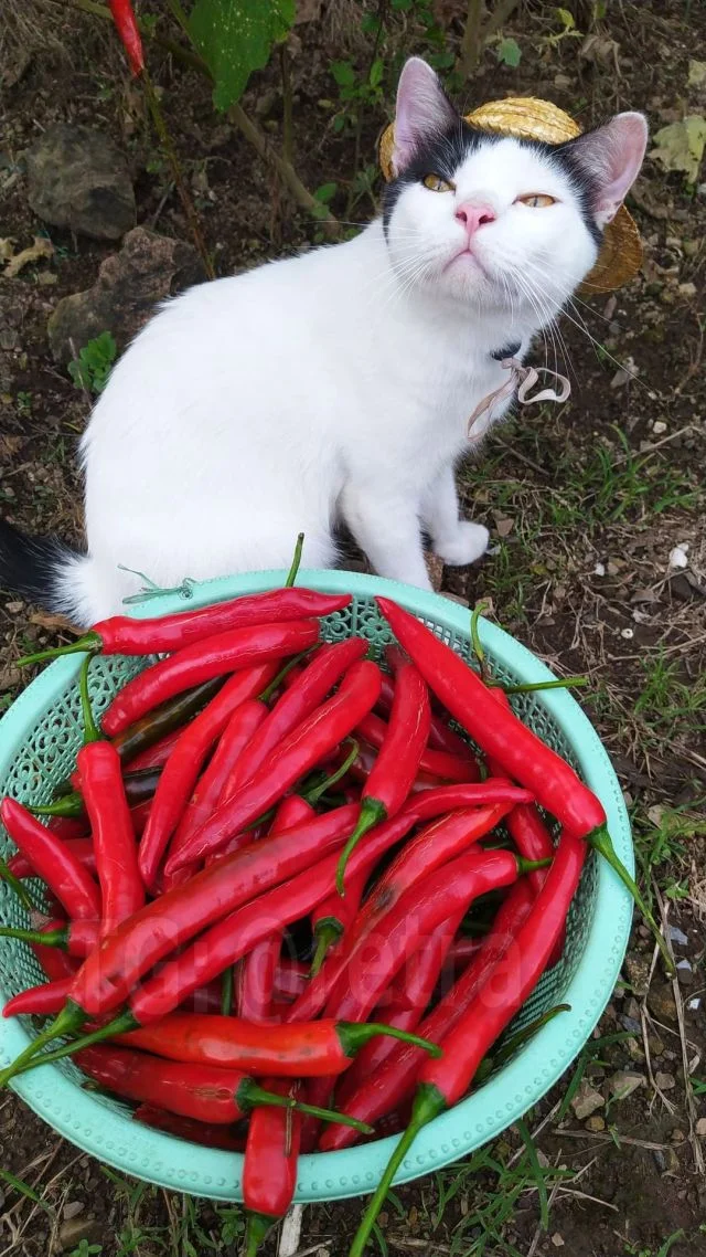 Ну хватит уже обижать котиков и говорить, что от них нынче пользы никакой нет. Вы только поглядите на этого дачника. Котофей трудился целый день и собрал солиднейший урожай! И ни разу не пожаловался на лапки, между прочим. Ну каков же красавец!
