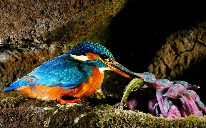 Зимородки выхаживают птенцов парой. Чтобы прокормить маленьких троглодитов, родители охотятся в два клюва!