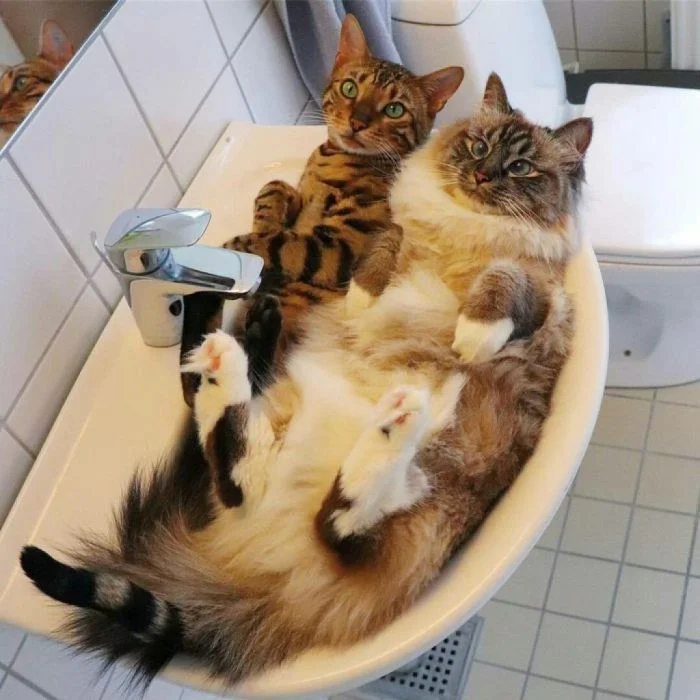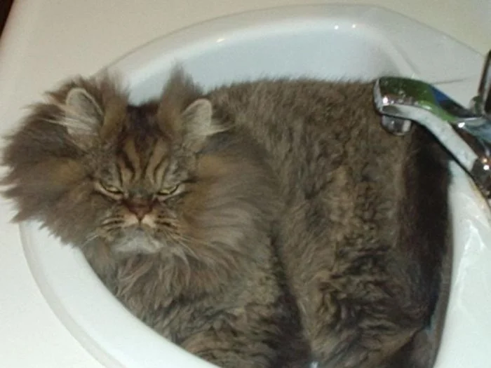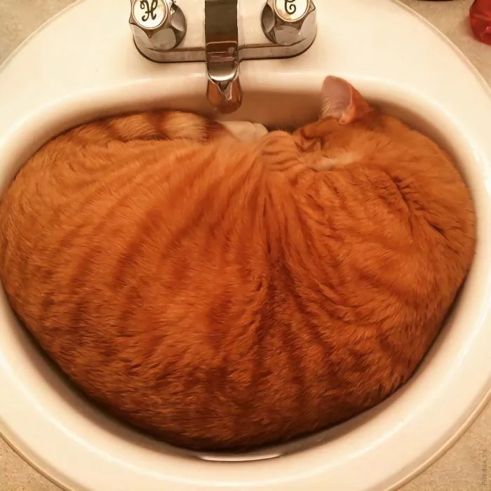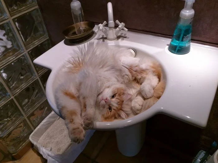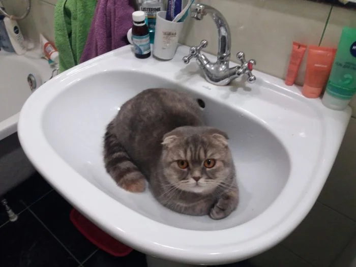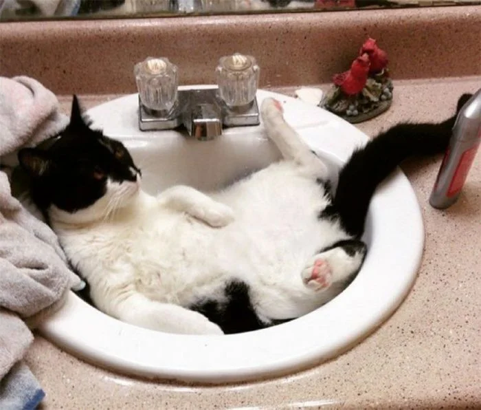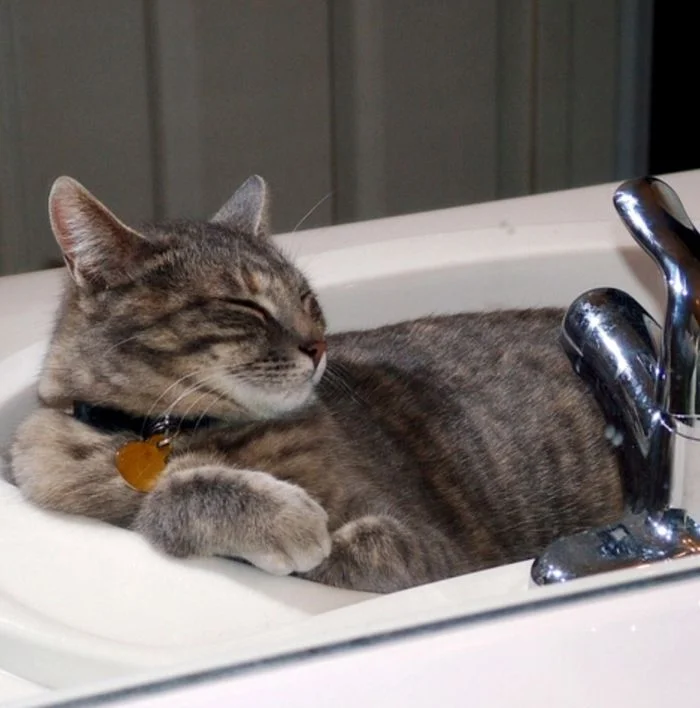 А света/плюшки нет. И поиски оказываются долгими и нудными. Сердце уже начинает предательски стучать, как вдруг котожемчужина обнаруживается… в неожиданном месте. Их пушистые величества почему-то любят возлежать в раковине. Почему? Возможно, форма уютная, или доступность воды успокаивает. В таких случаях надо быстро делать фото, ведь преисполненные томной лени котики на них выходят бесподобными.
