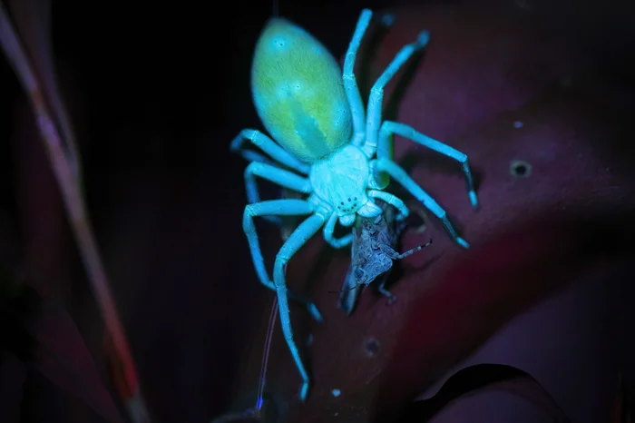 А все благодаря необычной кровушке. В жилах микроматы буквально течёт зелёный цвет. А точнее, особое вещество — микроматабилин. Пигмент содержится в гемолимфе и тканевой жидкости паука, окрашивая в салатовый всё. Даже яйца!