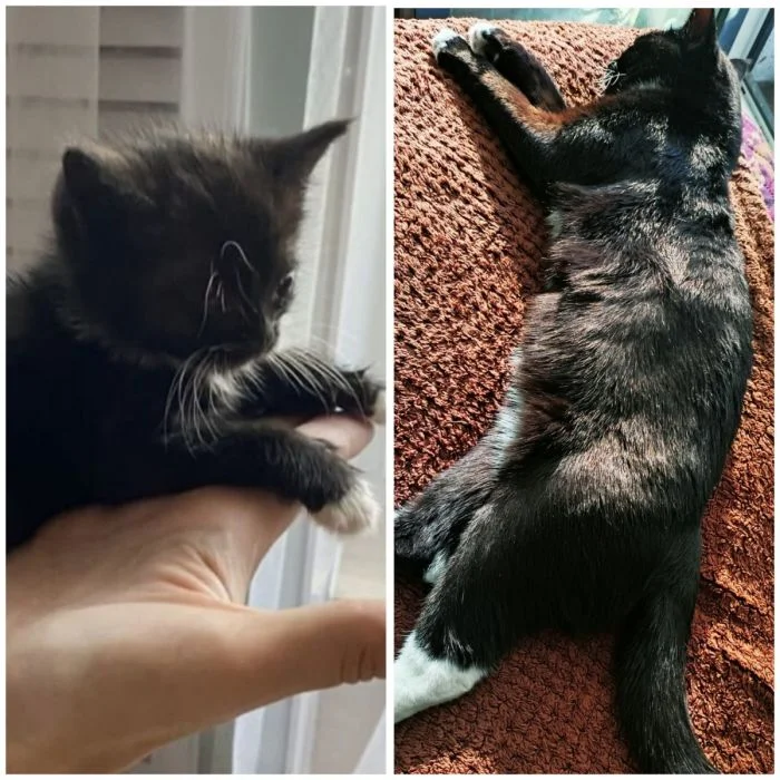 "Касяндра 11 лет назад. Подобрали в подъезде в 30-градусный мороз. Это её первый вечер у нас, где-то месяц ей был. Она же сейчас".