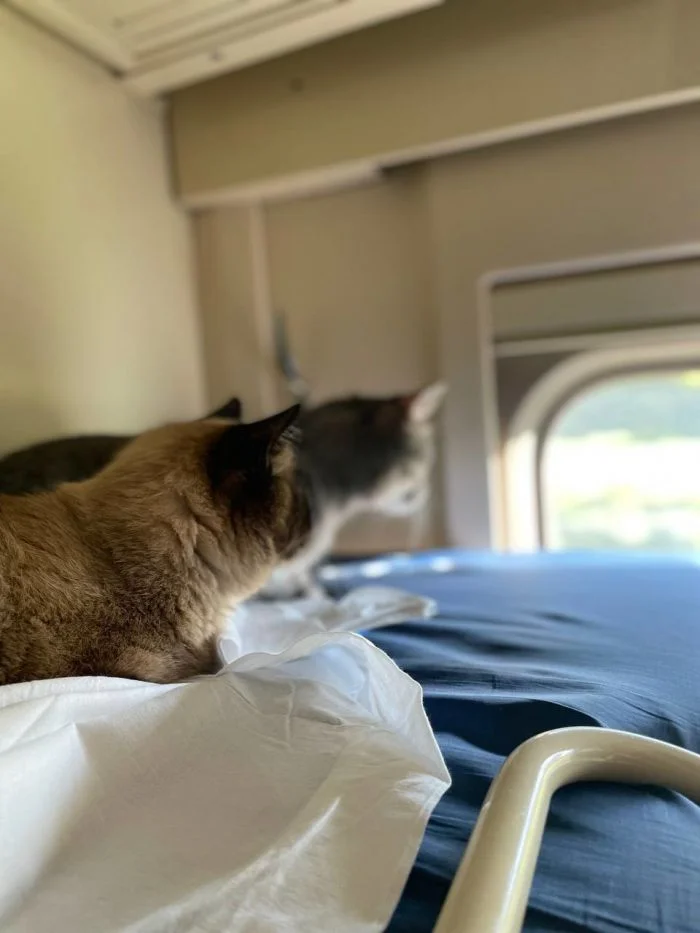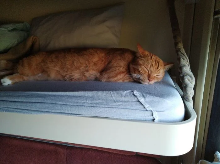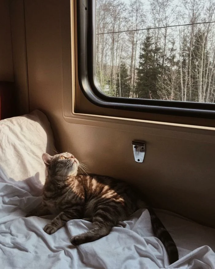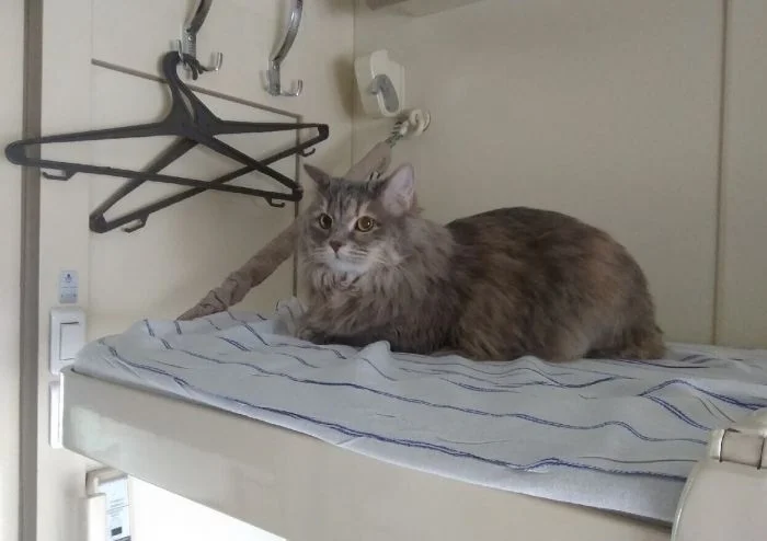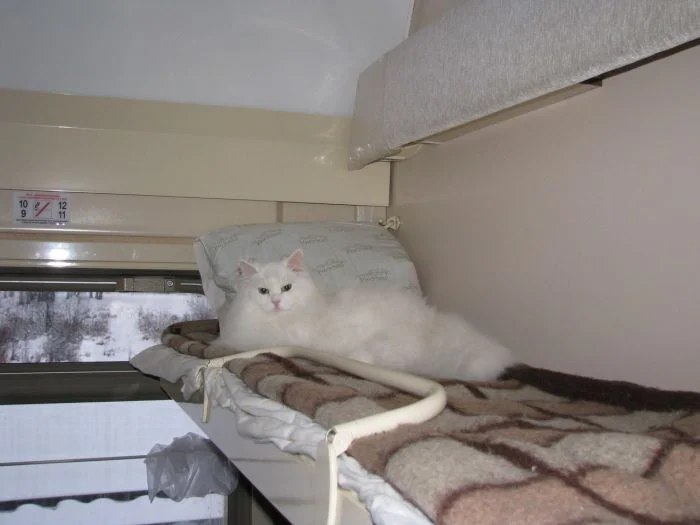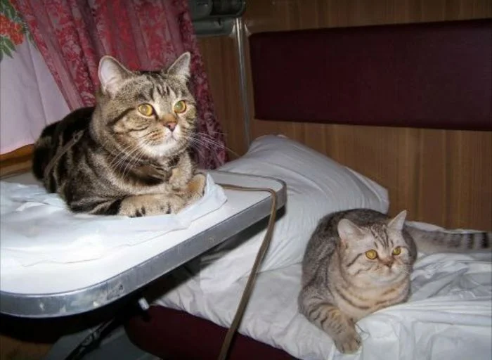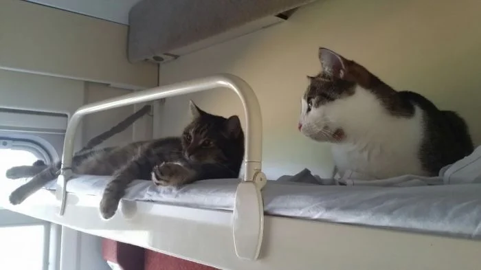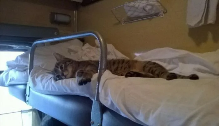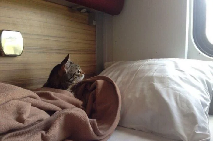 Хотя такие поездки сопряжены с определёнными неудобствами, всё же поезда продолжают оставаться самым популярным видом общественного транспорта в мире. И подтвердить это могут котики, которые с огромным удовольствием путешествуют вместе с хозяевами и выглядят при этом так органично, что невольно хочется поддаться магическому обаянию меховых комочков, немедленно купить билет и отправиться туда, где стук колёс, крепкий чай в металлических подстаканниках и предвкушение новизны, перемен и гармонии.