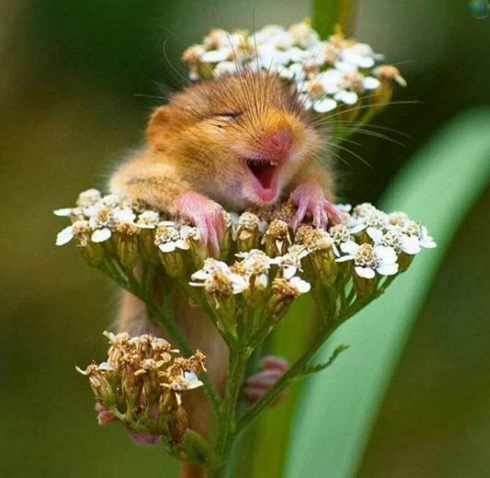 Однако следует иметь в виду, что ни смех крыс, ни, тем более, смех птиц не сопровождается специальной мимикой, которую мы, люди, могли бы охарактеризовать как улыбку. Так что приведённые здесь фотографии "смеющихся животных" – просто для красоты. Вот мышь: