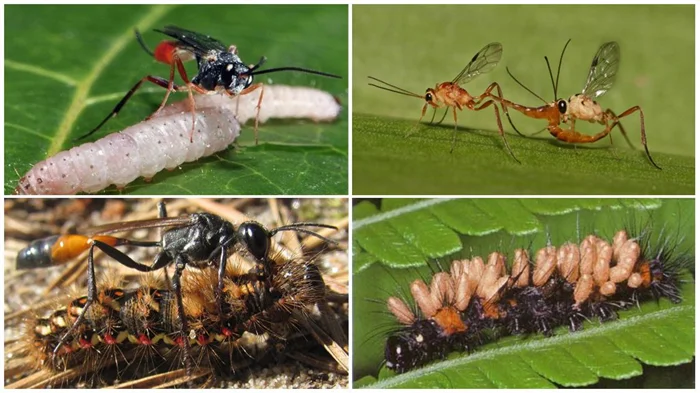 Есть яйцеклады тонкие и острые — для прокола, например, чьей-нибудь спины. Таковы осы-наездники. Они откладывают яйца прямо в тело другого насекомого, и подселенец потом жертву изнутри просто-напросто съедает. Оса-родительница, в зависимости от того, к какому виду относится, выбирает разных жертв и разные способы «внедрения». Некоторые просто садятся на спину к какой-нибудь незадачливой гусенице и делают своё грязное дело.