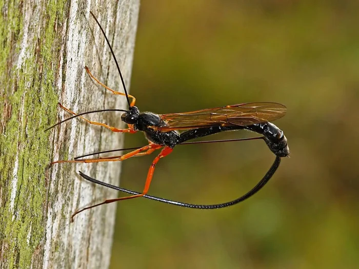 Но вот кому-то перед этим надо древесину «пробурить»! Представительницы ос-наездниц рода Мегарисса и Долихомитус суют яйцеклад прямо через ствол! Эти насекомые делают кладку внутрь личинок древесных жуков: усачей, златок. Почуять «колыбельку» они способны на глубине до 4 сантиметров. Чтобы до неё добраться, оса бурит дырку прочной и острой оболочкой яйцеклада.