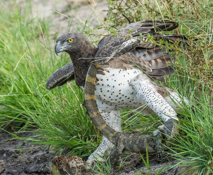 Обычно боевые орлы нападают на цесарок, уток и шпорцевых куриц. Но они достаточно сильны, чтобы охотиться на крепких крупных птиц, вроде журавля или дрофы Кори весом до 8 кило. А ещё они достаточно ловки и умелы, чтобы десятками уплетать манёвренных общественных ткачиков весом всего в 18-50 грамм!