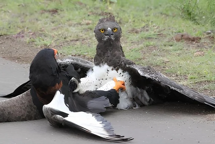 А порой боевые орлы нападают даже на других крупных хищных птиц. Впрочем, это не самая лучшая идея, ведь можно получить сдачи. Интересно, что эти двое собрались делать дальше? В таком-то неловком положении.